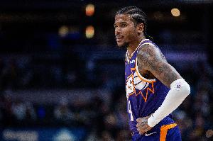 太阳球员杰伦·格林上半场表现不佳,进攻时依旧打得比较莽撞,两度挑战戈贝尔被大帽后,在半场结束前还出现一次空篮没有上进的情况。