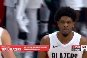 开拓者球员亨德森飙中三分,命中球队本场第25记三分,也是开拓者的球队新高。